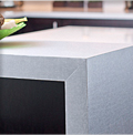 Comptoir fabriqué de stratifié fait sur mesure avec une bordure de surface solide, il offre les mêmes avantages que le comptoir carré en plus d'offrir un look plus raffiné, un nez plus résistant et permet l'installation d'un évier sous plan (undermount).